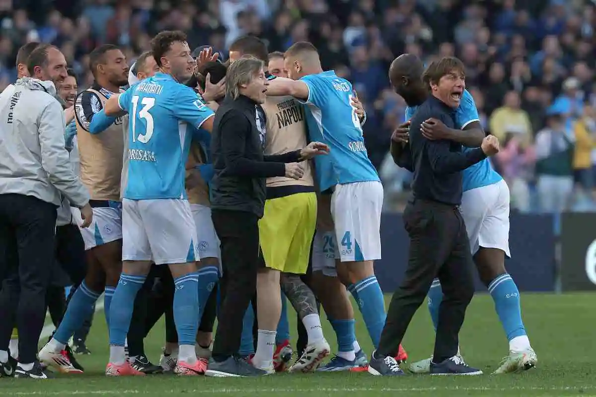 Il Napoli festeggia una rete con Il mister Antonio Conte - foto La Presse - SpazioNapoli.it