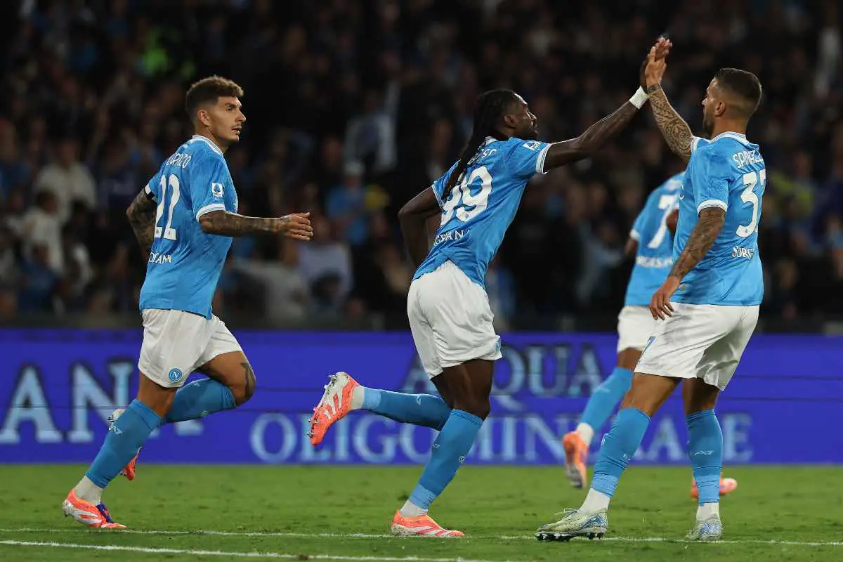 Anguissa celebra un’azione decisiva con i compagni del Napoli al Maradona