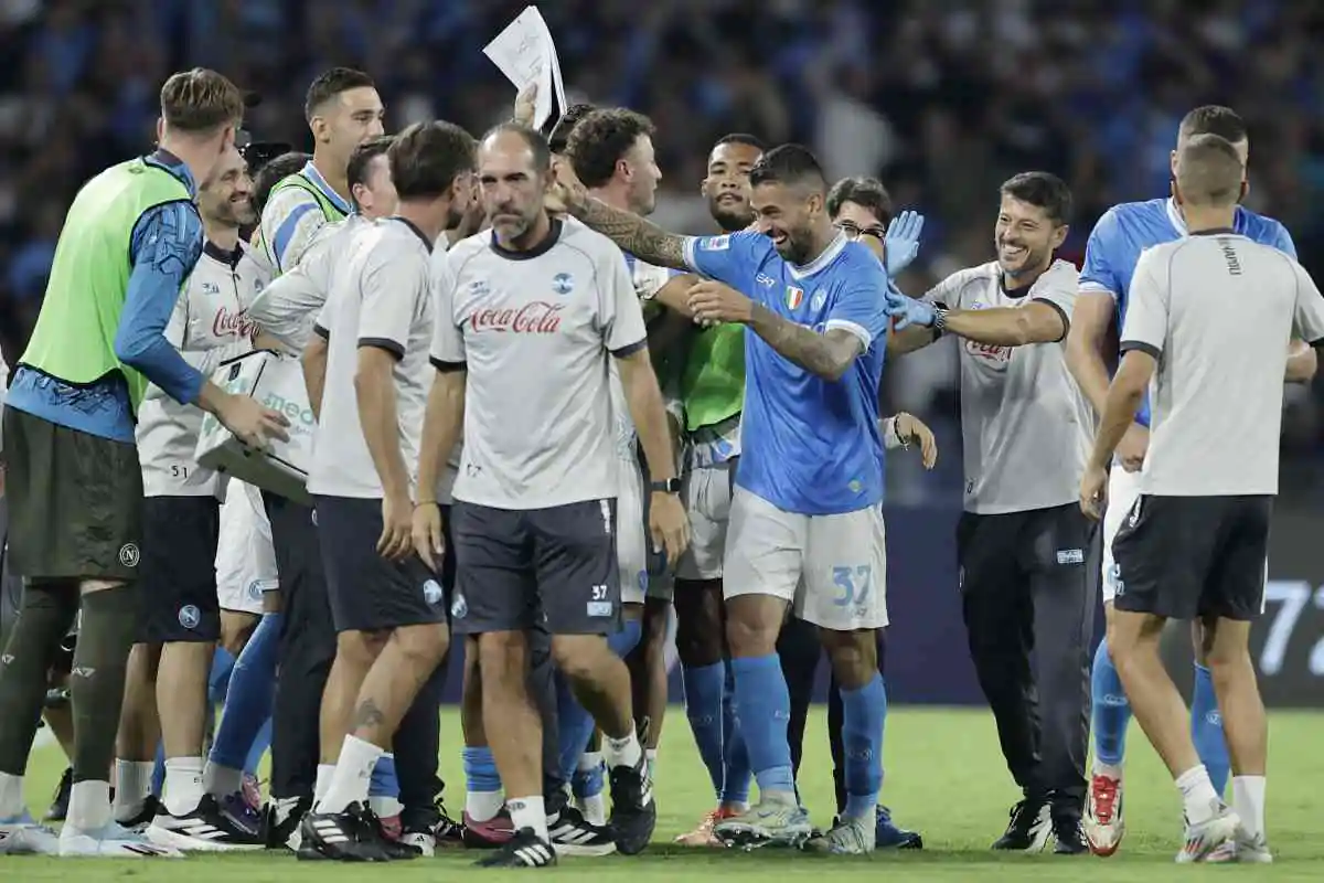 I giocatori del Napoli esultano al Maradona durante una partita di campionato nel 2025