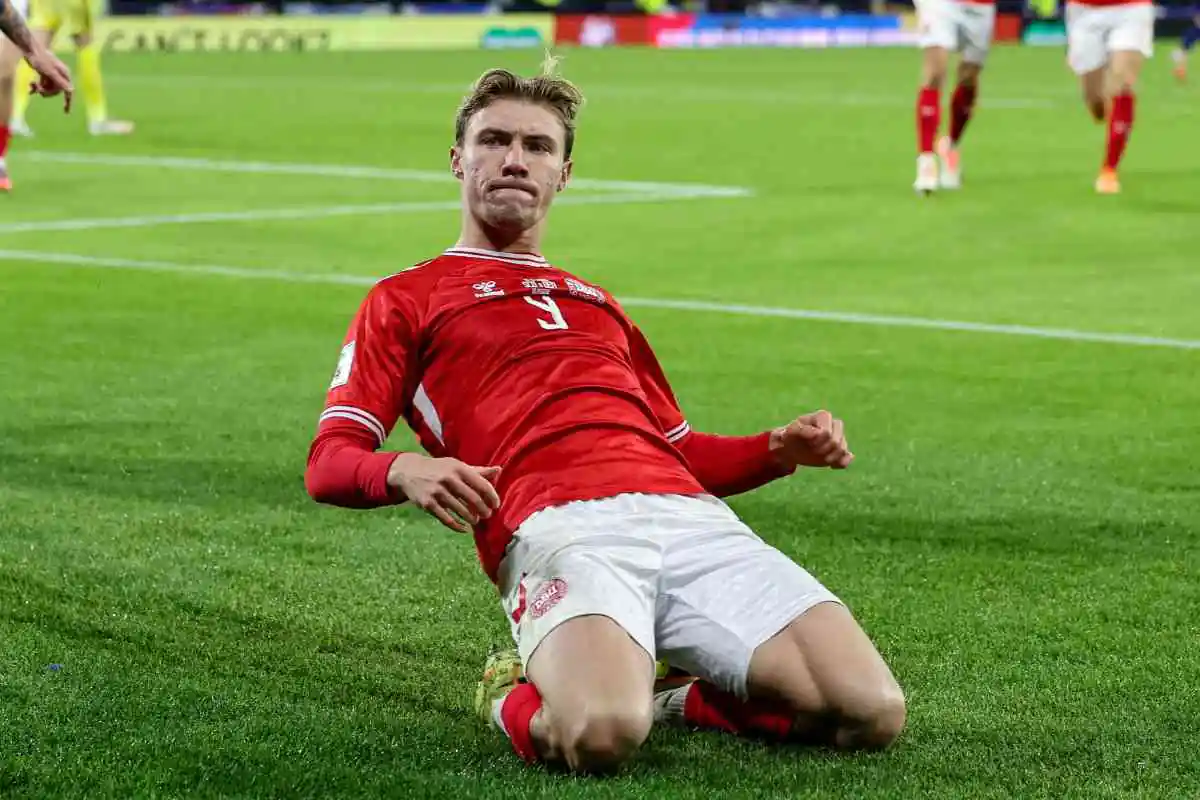 Hojlund esulta dopo il gol del pareggio contro la Scozia