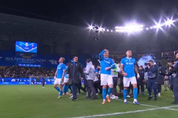 Dopo il triplice fischio del direttore di gara è iniziata la festa partenopea, con giocatori e staff diretti verso il campo a esultare insieme per la vittoria del trofeo. Appena dopo la fine, le telecamere hanno però inquadrato il presidente Aurelio De Laurentiis e l’allenatore Antonio Conte.