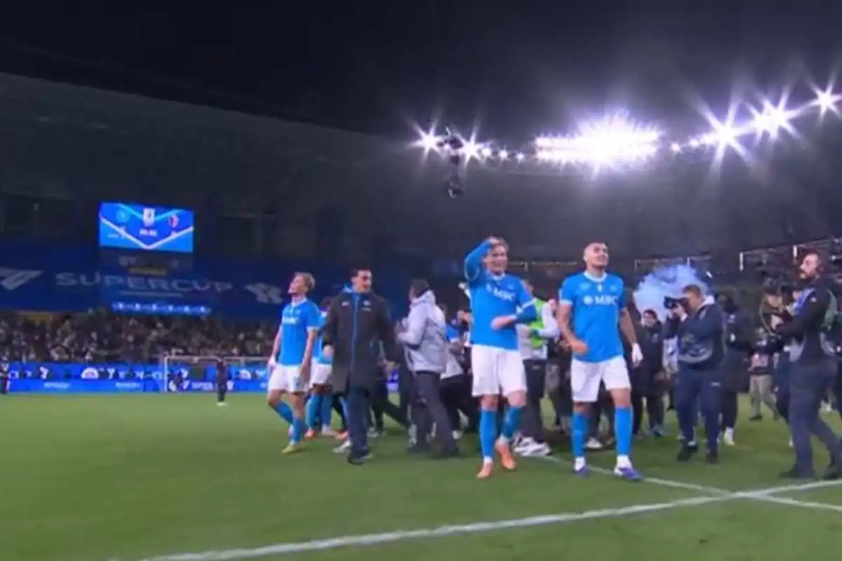 Dopo il triplice fischio del direttore di gara è iniziata la festa partenopea, con giocatori e staff diretti verso il campo a esultare insieme per la vittoria del trofeo. Appena dopo la fine, le telecamere hanno però inquadrato il presidente Aurelio De Laurentiis e l’allenatore Antonio Conte.