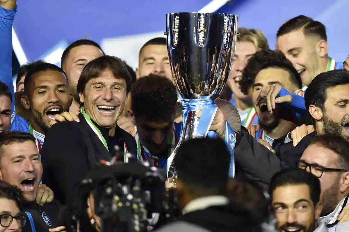 I calciatori del Napoli e Conte con il trofeo
