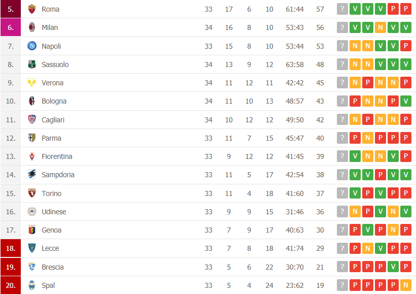 CLASSIFICA – Il Milan al sesto posto stacca il Napoli: azzurri a -3 dai rossoneri