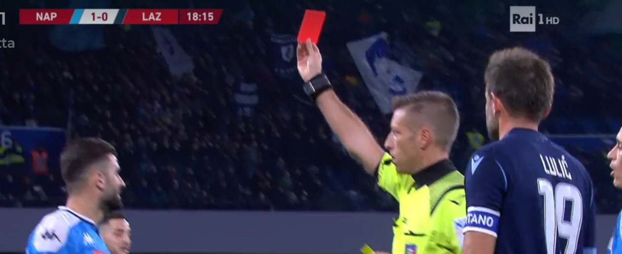 Napoli-Lazio, doppia espulsione nei primi 30′ di gara: rosso per Hysaj e Lucas Leiva