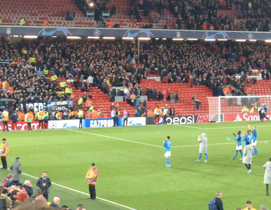 FOTO – Liverpool-Napoli, i tifosi azzurri chiamano la squadra a fine gara: applausi per loro!