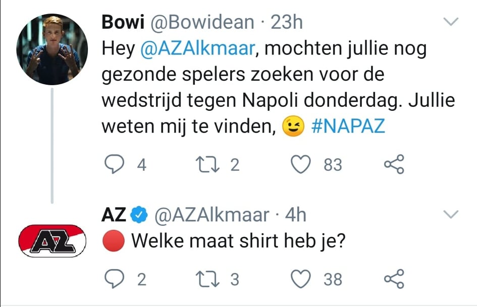 Un tifoso si propone all’AZ per giocare la partita a Napoli, la simpatica risposta del club olandese: “Che taglia porti?”