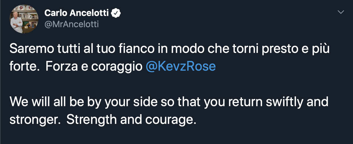 Ancelotti: “Saremo tutti al tuo fianco in modo che torni presto e più forte! Forza e coraggio Malcuit”
