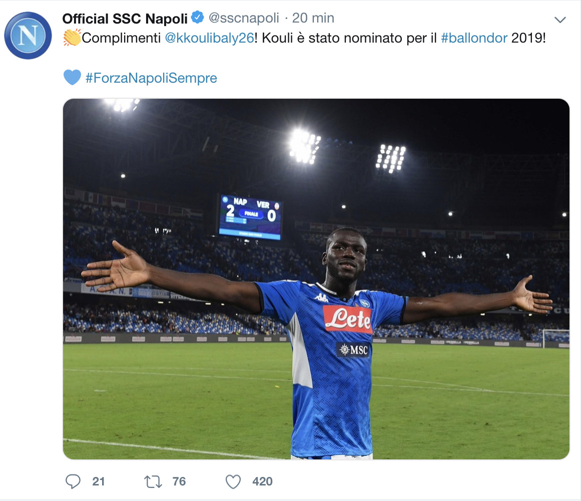 Koulibaly nei 30 finalisti del Pallone d’Oro: arrivano le congratulazioni del Napoli su Twitter