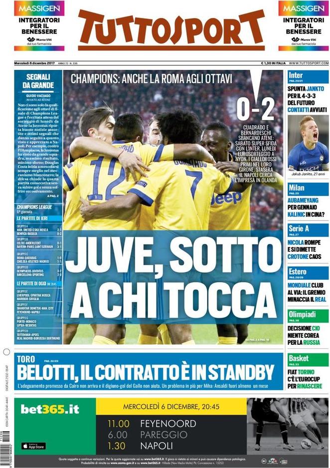 PRIME PAGINE – “Juve e Roma agli ottavi di Champions League, il Napoli cerca l’impresa in Olanda”