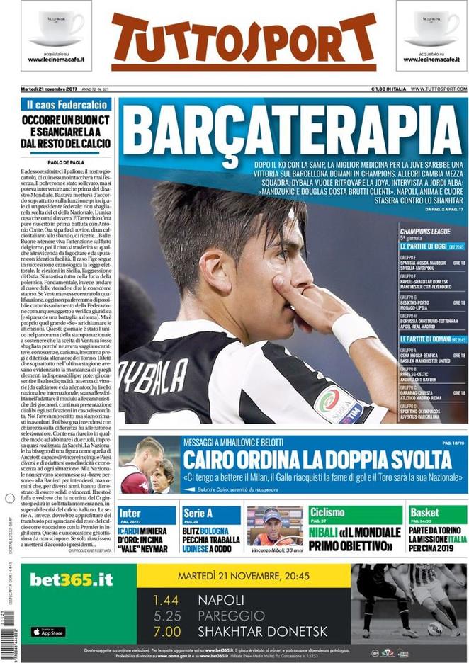 PRIME PAGINE – Torna la Champions: “Barçaterapia per la Juve. Napoli, anima e cuore contro lo Shakhtar”