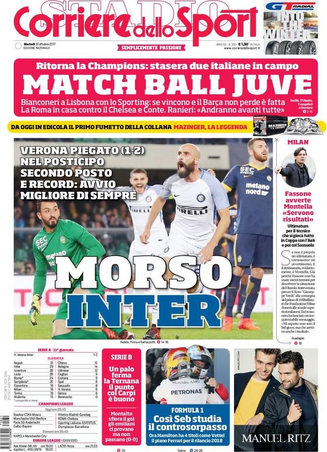 PRIME PAGINE – “Morso Inter, Verona piegato 1-2. Match ball Juve, con lo Sporting vale doppio”