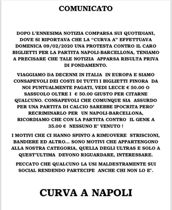I tifosi della Curva A: “Nessuna protesta contro il biglietto per Napoli-Barcellona! Viaggiamo in Europa e siamo consapevoli dei costi” (FOTO)