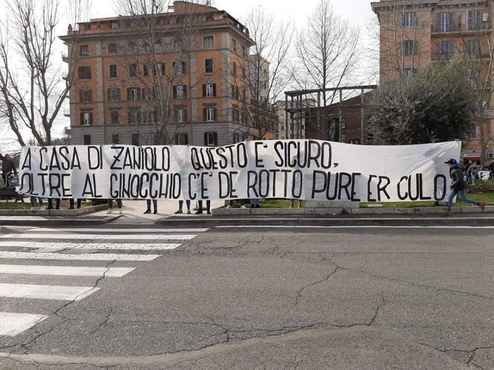 FOTO – Nuovo striscione per Zaniolo dai tifosi della Lazio: “A casa tua oltre al ginocchio, c’è di rotto pure…”