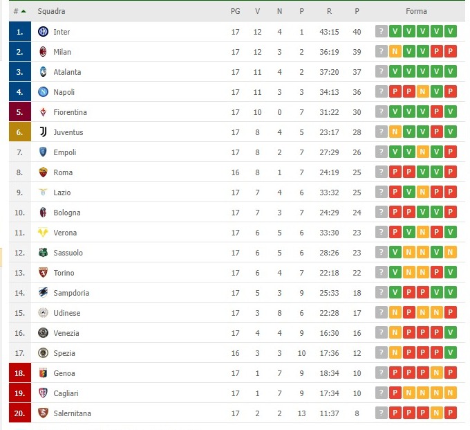 CLASSIFICA – Brutta sconfitta per il Napoli che crolla al quarto posto e si allontana dalla vetta