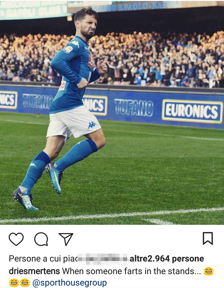 FOTO – Esilarante Dries Mertens, posta la foto della sua esultanza: “Quando qualcuno scoreggia sugli spalti”