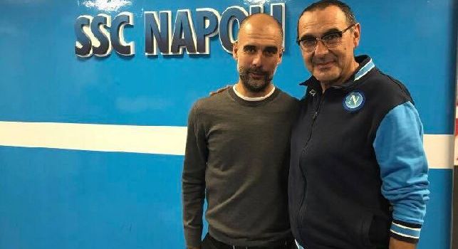 FOTO – Sarri e Guardiola insieme dopo la partita, il Napoli: “Sconfitti da un grande City, ma ha vinto il calcio”