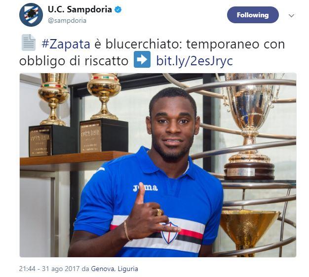 UFFICIALE – Zapata e Strinic sono della Sampdoria. Duvan: “Non ho trascorso bei giorni, ma ora sono felice”